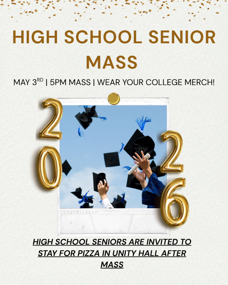 To celebrate to upcoming 2026 high school graduates, we are hosting a pizza social in Unity Hall after the 5pm mass! We encourage all of our seniors to wear their college gear or any merch that represents their next steps to the 5pm mass.
