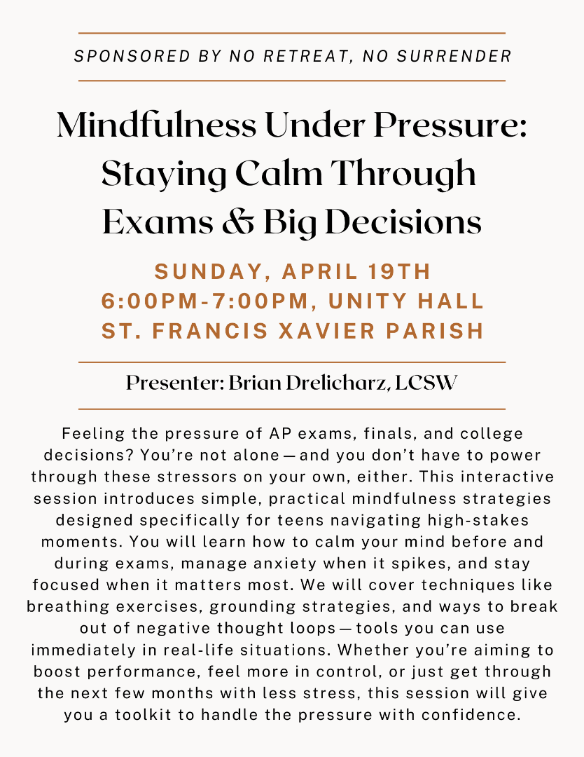 Location: The Upper-room (teen space). If your teen is not going to mass, ring the door bell on door 3 on Spring Ave (Mary Garden door).