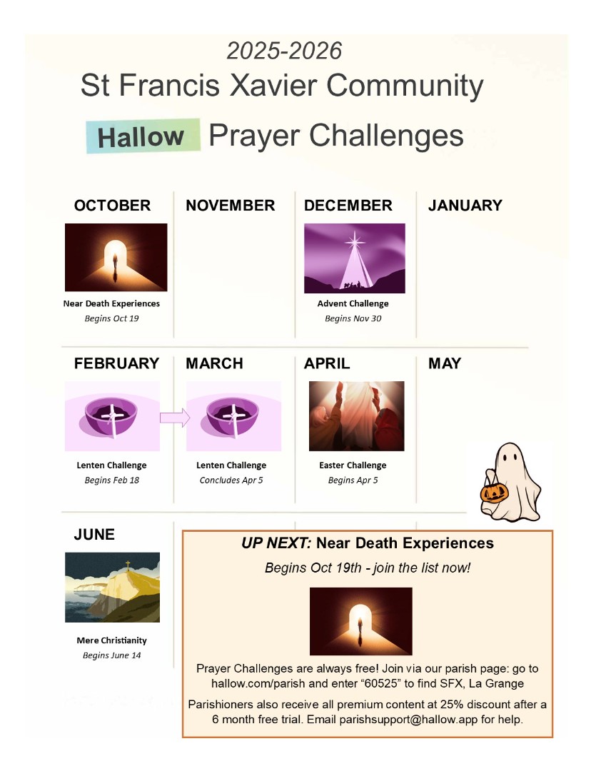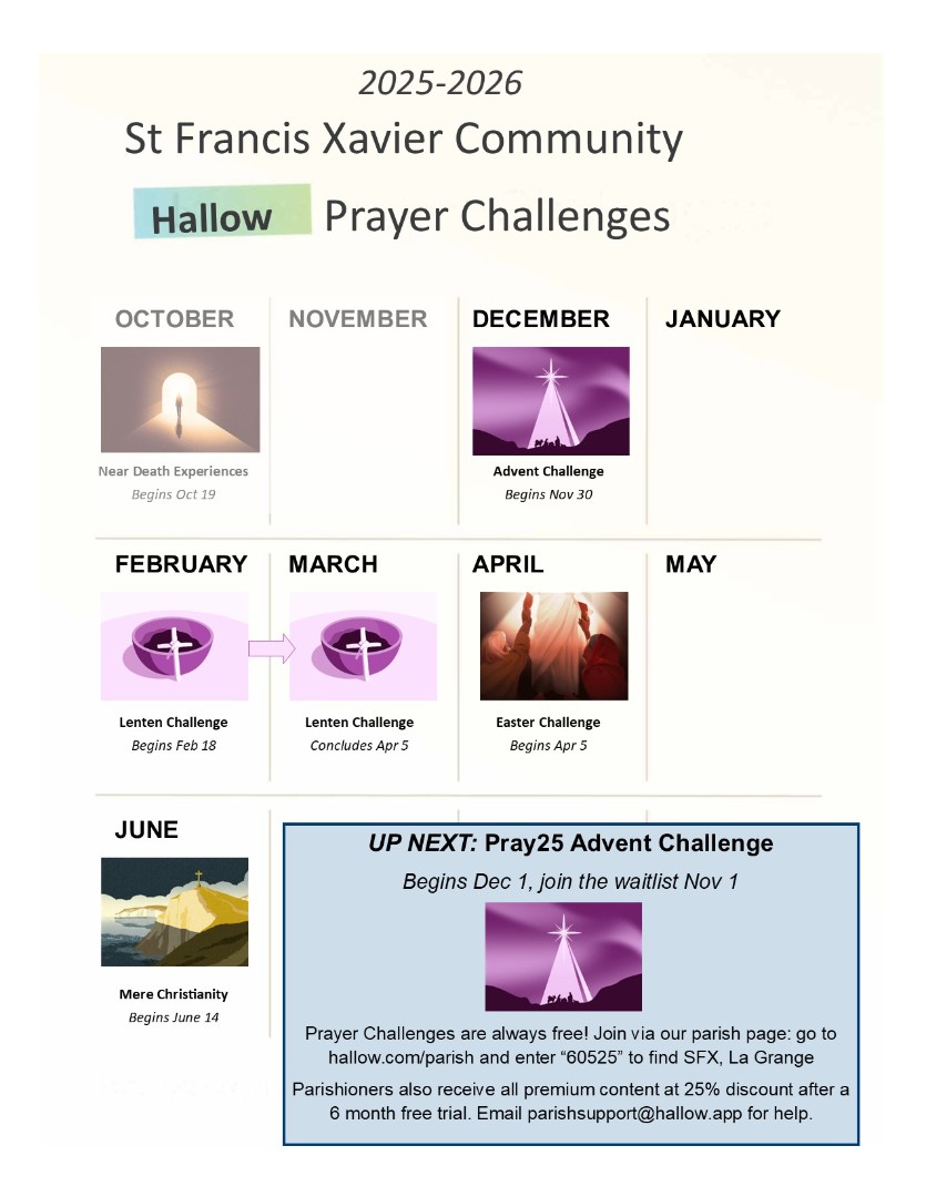 Hallow Summer Prayer Challenge - Summer with the Psalms Begins June 1, 2025 Join St Francis Xavier Parish on Hallow this summer in praying all 150 psalms in 30 days. Offer up psalms of praise, lament, and thanksgiving as you unite your prayer with God's Word.